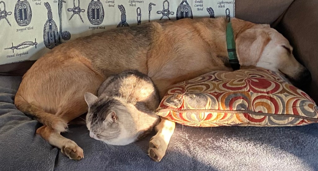 I’m lucky. The Weather Channel can prophesy as it pleases; this husband, father, grandfather and reverend, who looks out upon an enchanted yard, is comforted by much love and warmth and enjoys the company of a dog so satisfied that he sighs in his sleep.